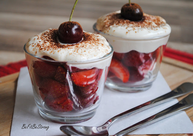 U mnie podana na ćwiartkach kaszubskich truskawek, posypana kakao bez cukru i udekorowana czereśnią.