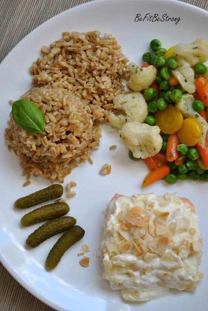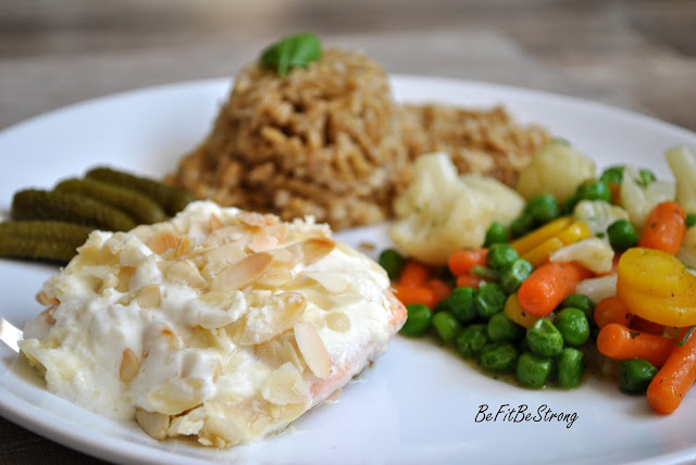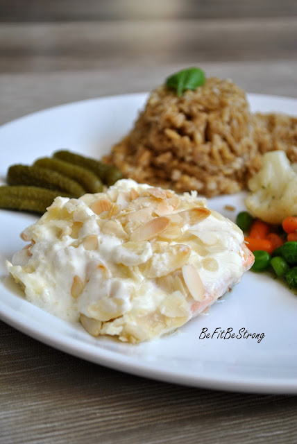 A na dzisiejszy obiadek proponuję lekkiego łososia z posmakiem cytrynowym, którego delikatnie kwaskowy smak podkreśla kwaśna śmietana i pieczone migdały. Ta kompozycja sprawi, że nie będzie to ostatni raz kiedy jeść będziecie tak przyrządzonego łososia, zapewniam Was – zrobicie go jeszcze raz i jeszcze raz. Nawet moja kochana mama (jest specjalistką od przyrządzania ryb i ich prawidłowego smaku) stwierdziła, że tak przygotowany łosoś jest najlepszym jakiego w życiu jadła. W dodatku nie trzeba znać się na rybach, może być to pierwszy raz kiedy spróbujecie zrobić rybkę na obiad, ale jestem pewna, że wyjdzie Wam w 100%. Jest to bardzo prostu przepis, a w smaku jak z najlepszej knajpy! 🙂