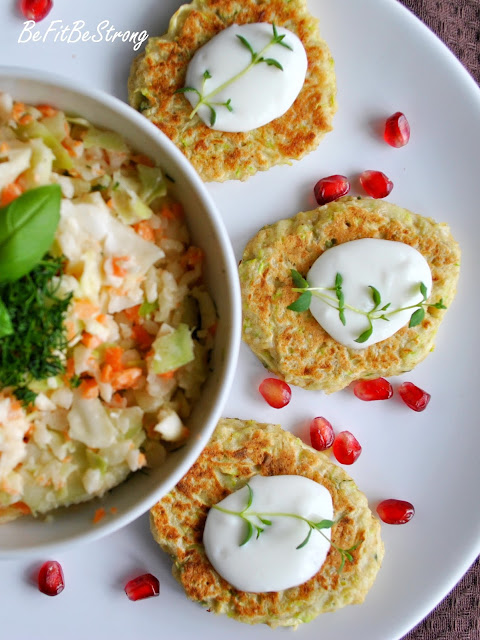 A dzisiaj, w sumie nic nadzwyczajnego, gdyż placki z cukinii. Lecz tym razem są one tymiankowe. Uwielbiam tymianek i mogłabym dodawać go do większości moich potraw, ale nie można popadać w rutynę i nudę! Dodatkowo placuszki mają towarzystwo w postaci surówki z kalarepki. Przepis na ok. 10 placuszków, jeden to ok. 54kcal.