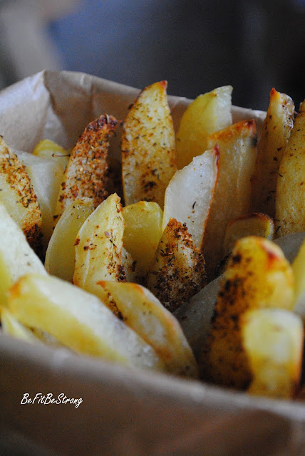 Z góry przepraszam Was za brak systematyczności z dodawaniem przepisów. Póki co przechodzę jeden z cięższych okresów w życiu studenta i muszę wykorzystać każdą możliwą chwilę na naukę. Jeszcze tylko jeden tydzień i zaczynam praktyki, więc może wtedy nieco odpocznę i znajdę czas na bloga. Wczoraj przypałętało się do mnie jakieś przeziębienie, ale mam nadzieje, że rozprawię się z nim jak najszybciej. Dzisiaj, chciałabym podrzucić Wam przepis na frytki z ziemniaków. Jestem ogromną fanką ziemniaków i frytek, dlatego wolę przygotowywać je w swojej, zdrowszej i odtłuszczonej wersji niż zajadać się tymi ociekającymi tłuszczem, bądź kupowanymi w sklepie mrożonkami (na pewno nie wyglądałabym tak jak teraz, tylko +20kg więcej). Na co czekacie? Do dzieła!
