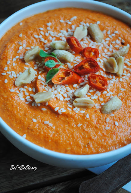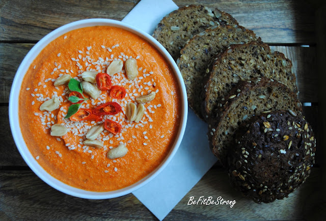 Papryki myjemy, kroimy na ćwiartki, usuwamy gniazda nasienne, układamy na blasze wyłożonej papierem do pieczenia – skórką do dołu i pieczemy w 180 stopniach przez 40 minut. Po upieczeniu od razu przekładamy do woreczka strunowego lub rękawa do pieczenia, szczelnie zamykamy i odstawiamy na 20 minut. Po tym czasie, skórka powinna łatwo odchodzić od papryk, w ten sposób obieramy je wszystkie. Wszystkie składniki umieszczamy w misie blendera i miksujemy do uzyskania prawie gładkiej konsystencji.
