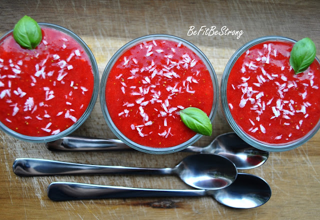 Do dużej miski wlewamy jogurt, mleczko kokosowe i wsypujemy nasionka Chia, w tym momencie możemy dosłodzić. Dokładnie mieszamy i odstawiamy na 2-3 godziny, bądź całą noc do lodówki. Przed wyjęciem miksujemy truskawki na mus. Podajemy w małych miseczkach układając pudding z nasionami na dnie i przykrywamy musem z truskawek. Dodatkowo udekorowałam wiórkami kokosowymi i listkami bazylii.