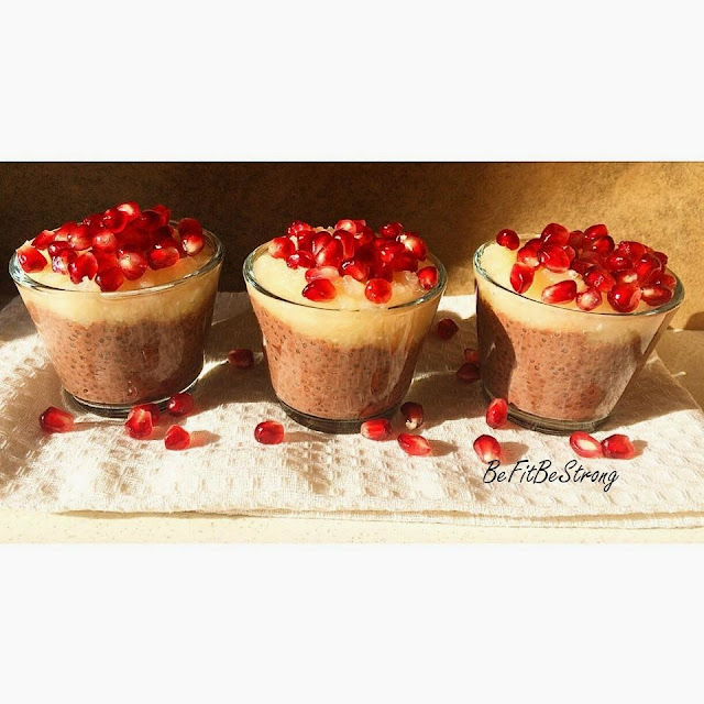 Dzisiaj, na umilenie dnia i na osłodzenie naszych kubeczków smakowych, kolejna propozycja na nasionka chia, ale w wersji kakaowej! Pamiętajmy, że nasionka mają właściwości wspomagające odchudzanie i są niesamowitą dawką kwasów tłuszczowych Omega-3, ale nie można przekraczać dziennej dawki 15g. (Jest to wartość jedynie orientacyjna, osoby przyzwyczajone do spożywania dużej ilości błonnika w ciągu dnia mogą sobie pozwolić na przekroczenie tej dawki). Wychodzi 5 porcji. 1 ma ok. 132g = 124kcal.